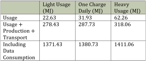 The energy consumption of the iPhone 4S during its use phase is highly dependent on the usage patterns, charging habits, and data usage of the user. Three scenarios are considered: light use, heavy use, and one charge a day. It was calculated that where light usage would contribute 22MJ to the phones overall embodied energy, heavy usage would contribute almost triple this at 62MJ. The iPhone 4S battery has a capacity of 1432mAh. The energy consumption can vary significantly depending on not only screen time, but how the phone is used. For example, streaming video can consume a lot of energy, while simply sending text messages will use much less.