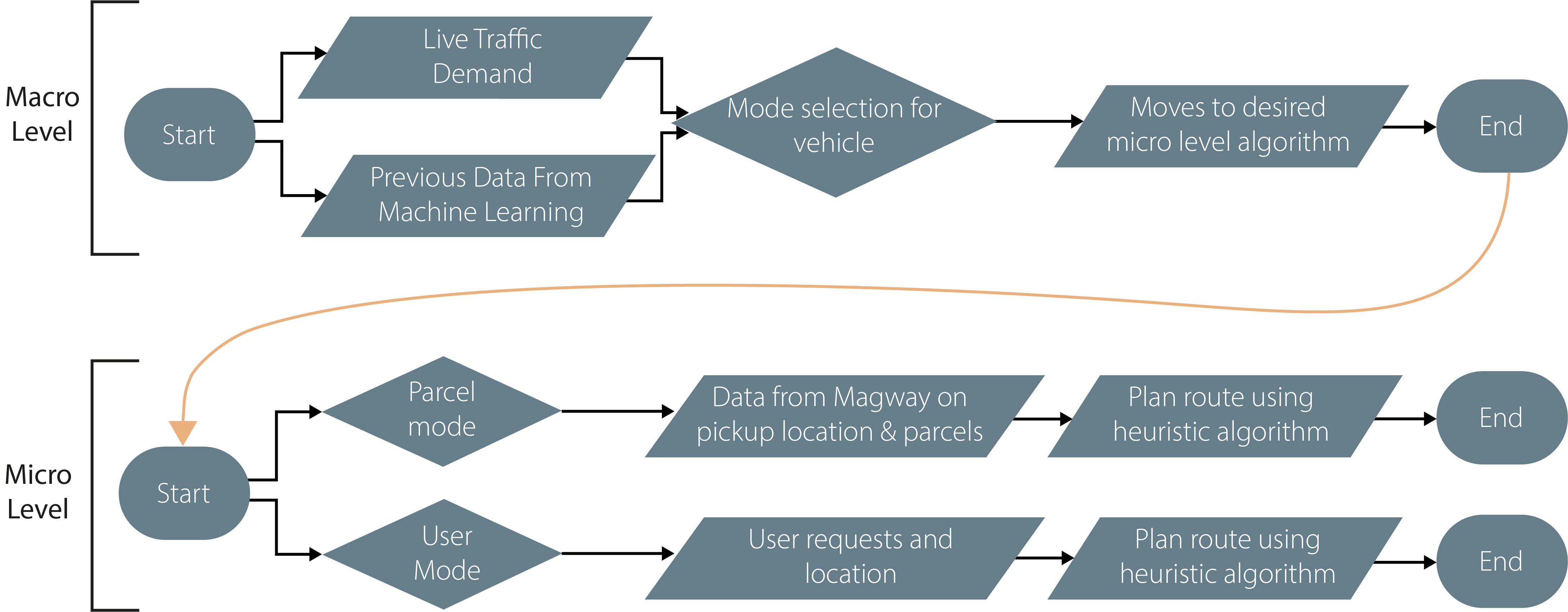 The principle of the operation of the system is that the fleet of vehicles in the urban areas will be predominantly setup to user 'mode' during the peak demand for travel, and at off peak times they will mostly transform to parcel mode. With the enabler of 5G in urban areas so that cars are connected to a central system, which can optimise the fleet of vehicles depending on the demand. This optimisation will be further developed.