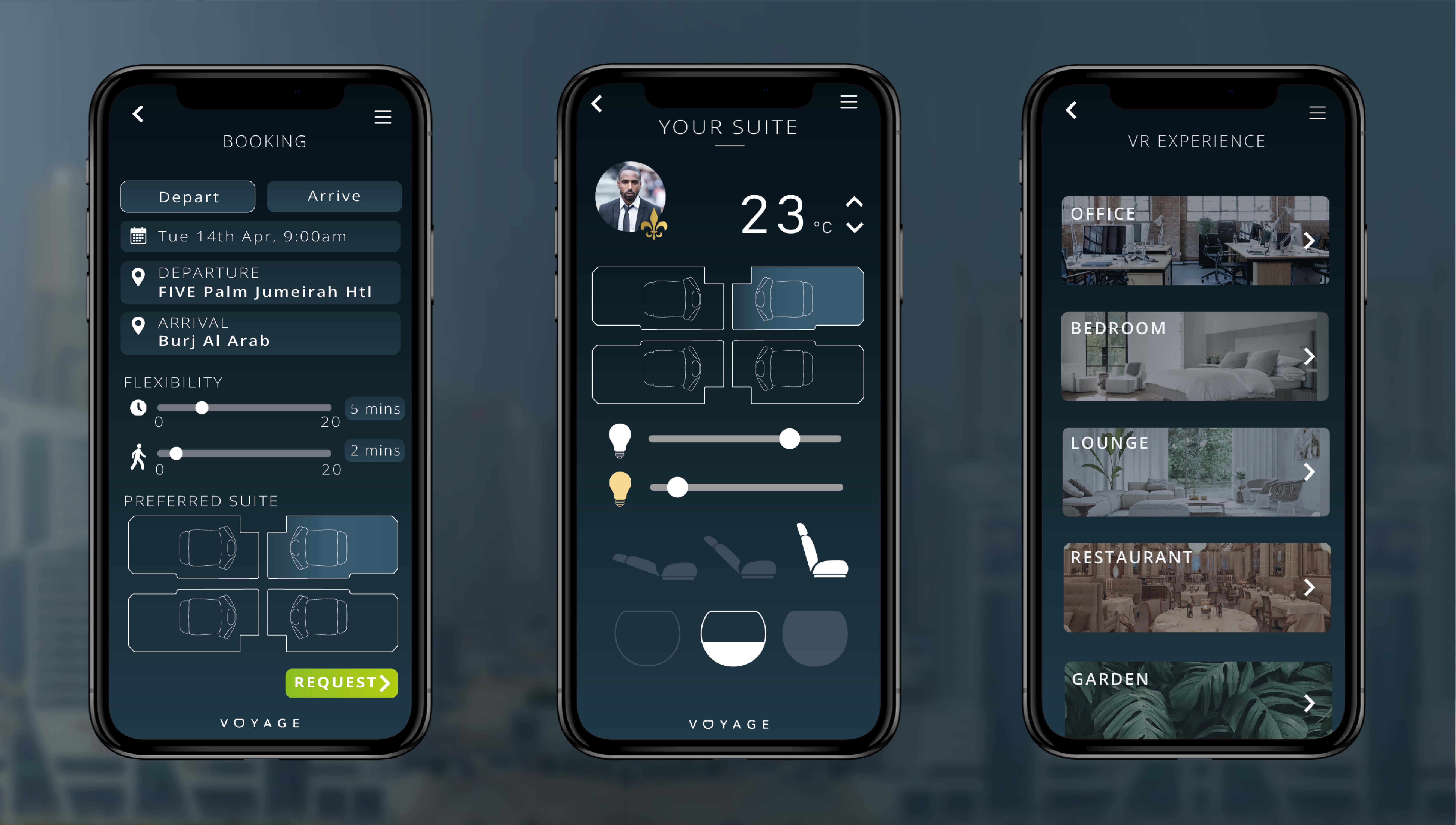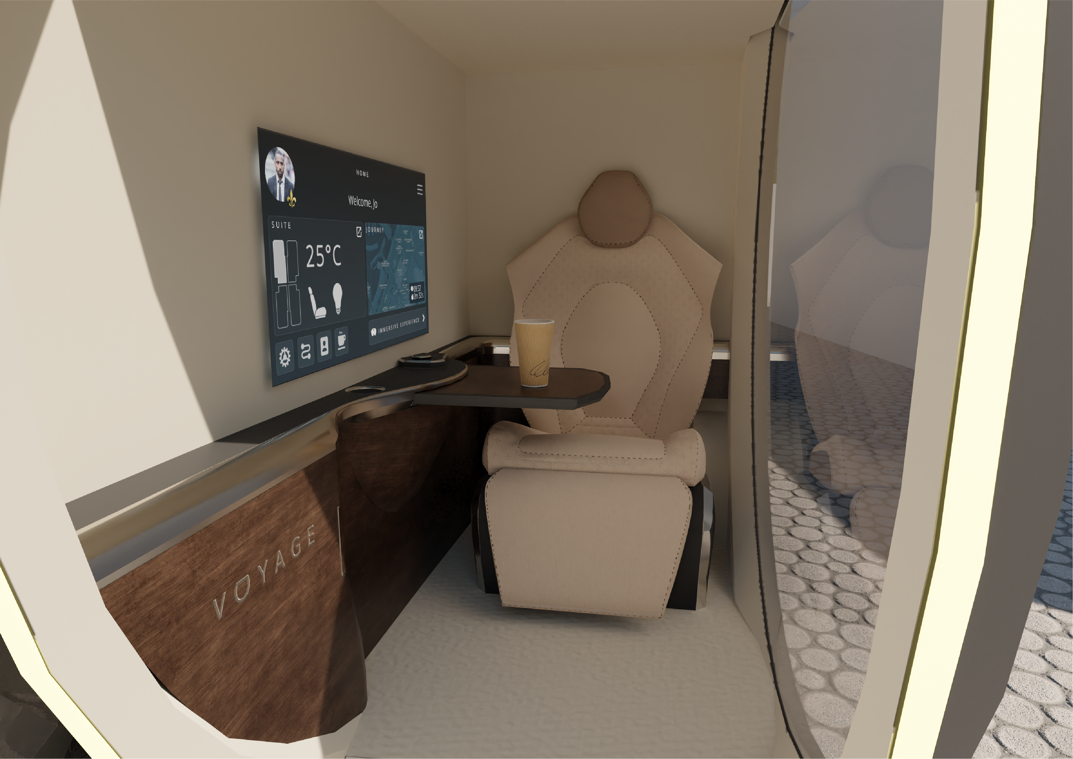 Upon boarding, the VOYAGE control panel, prominently featured in each suite (as illustrated in Figure 8), greets users with essential details such as their profile picture, allocated suite, current temperature, seat positioning, lighting intensity, location, route, and remaining travel time to the destination (default mode).