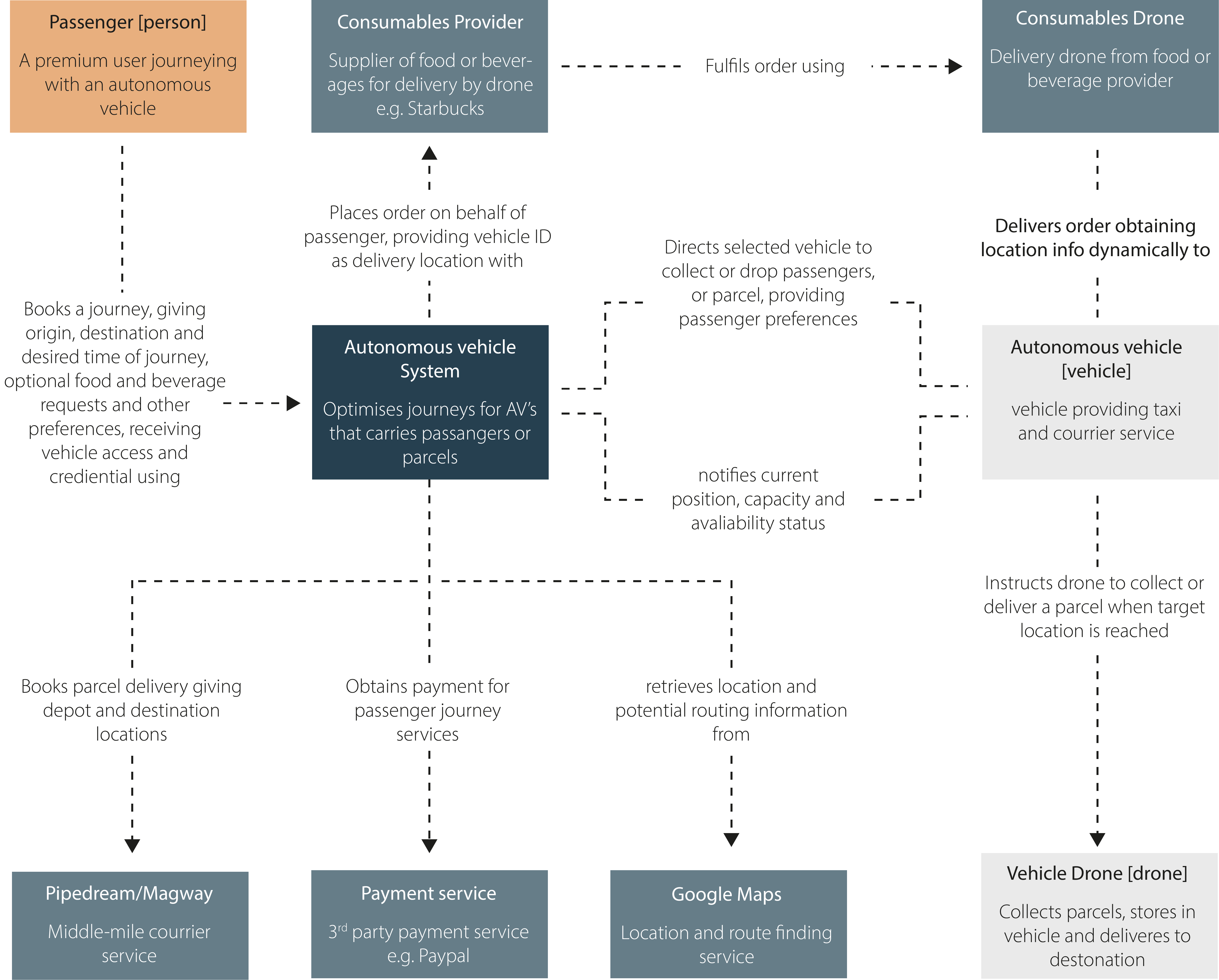 From the two design aims of parcel delivery and shared premium mobility, they were combined to form an overall proposed system. This system makes use of technology enablers such as drones, revolutionised middle mile delivery, and connected vehicles as well as infrastructure through 5G. The breakdown is done using the C4 method. This is 'level 1' of the system which is a simplified version so that an overview of all aspects can be clearly seen. For example, in the next level of the C4 diagram, the AV system box can be broken down further.