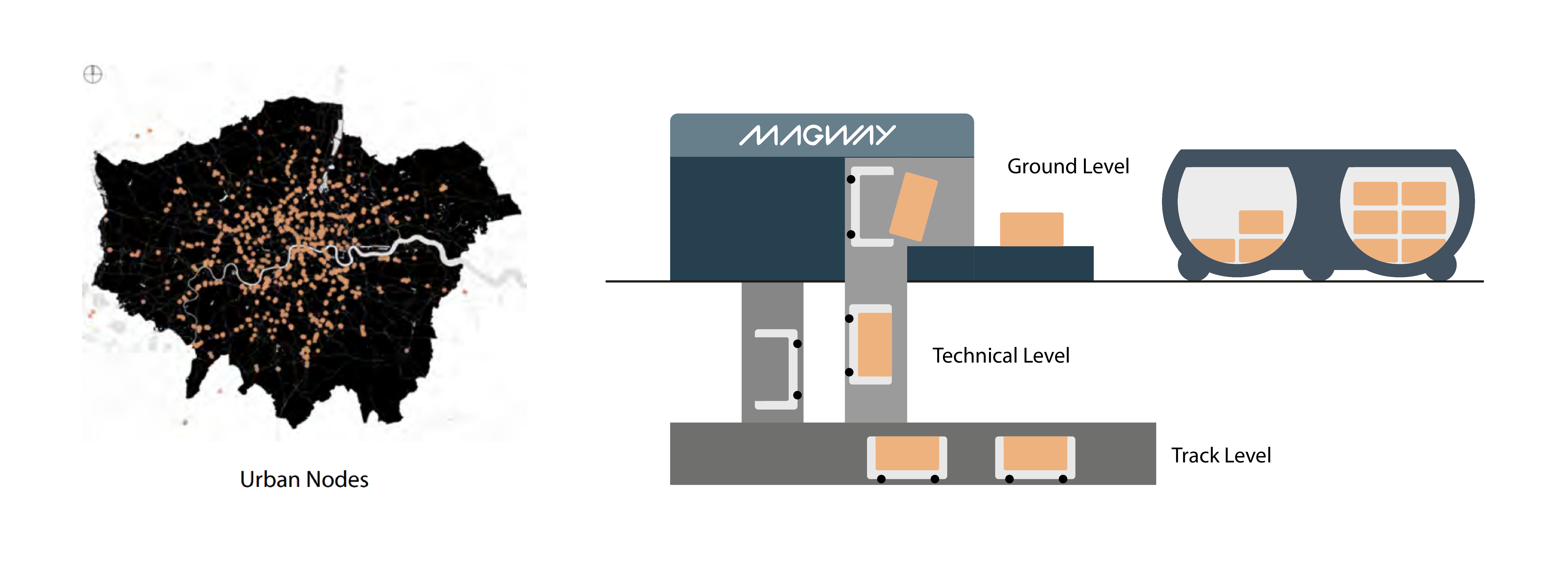 A key enabler in this future system is an urban network of micro-delivery stations where VOYAGE can autonomously collect parcels. Magway is a revolutionary middle-mile company. They plan to implement an urban network of pipes that will connect to these delivery station 'nodes,' which are mapped based on the residential population to be within a 15-minute cycle of 97% of London's population. This demonstrates their potential to serve the urban population and integrate a last-mile service for delivering packages directly to consumers' homes from the 'nodes.'