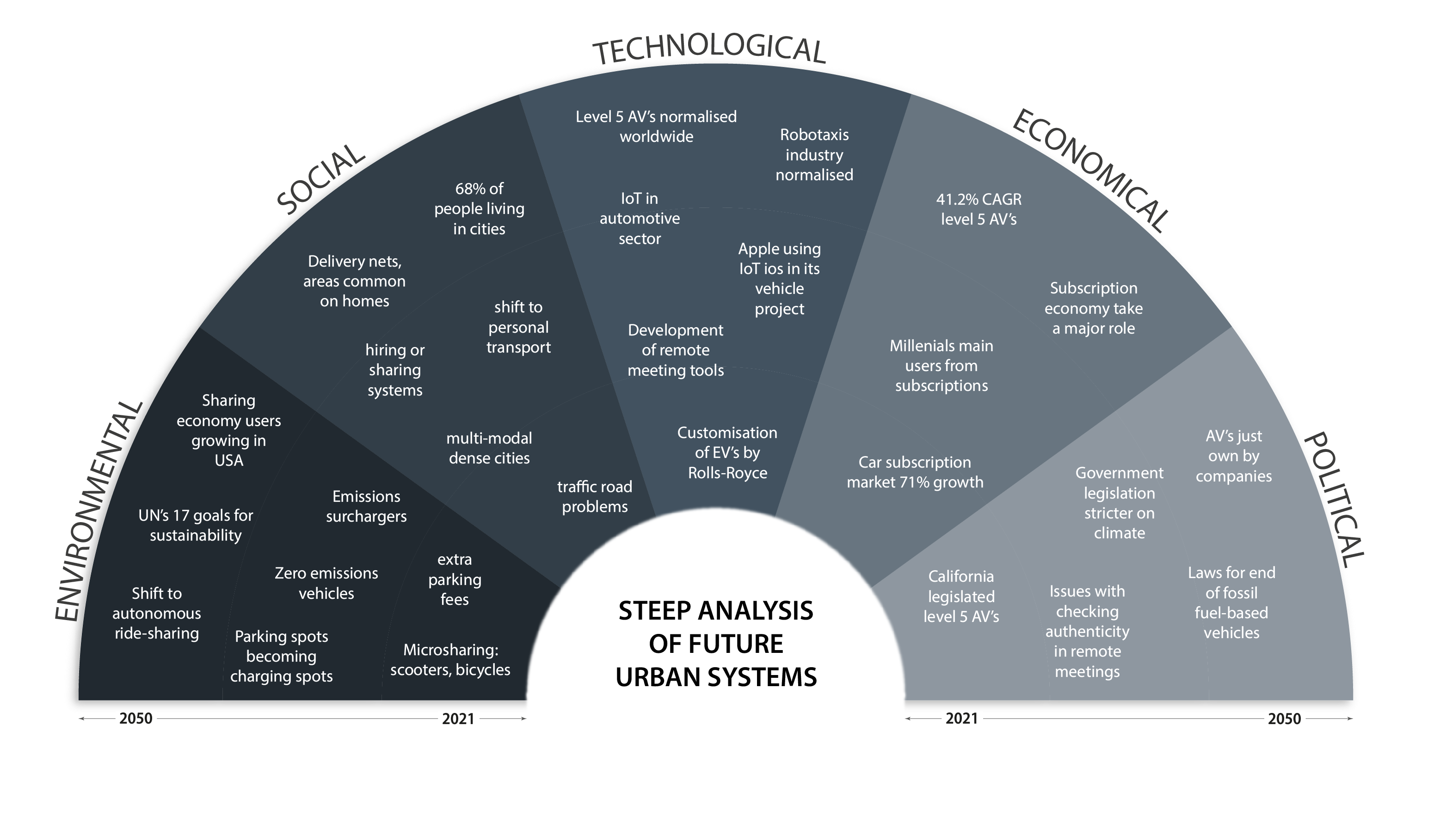 A report from the United Nations estimates that 68% of the world population will be living in cities by 2050 (UN, 2021), double the current urban population. With urbanisation increasing, cities are becoming the focal points of the world. It is therefore crucial to predict future trends in these areas, and identify potential issues, in order to mitigate challenges in this setting. To get a well-rounded view on future urban areas, a STEEP analysis was undertaken, and from this key related issues were picked out and researched further. Congestion was found to be the key challenge of future urban environments.